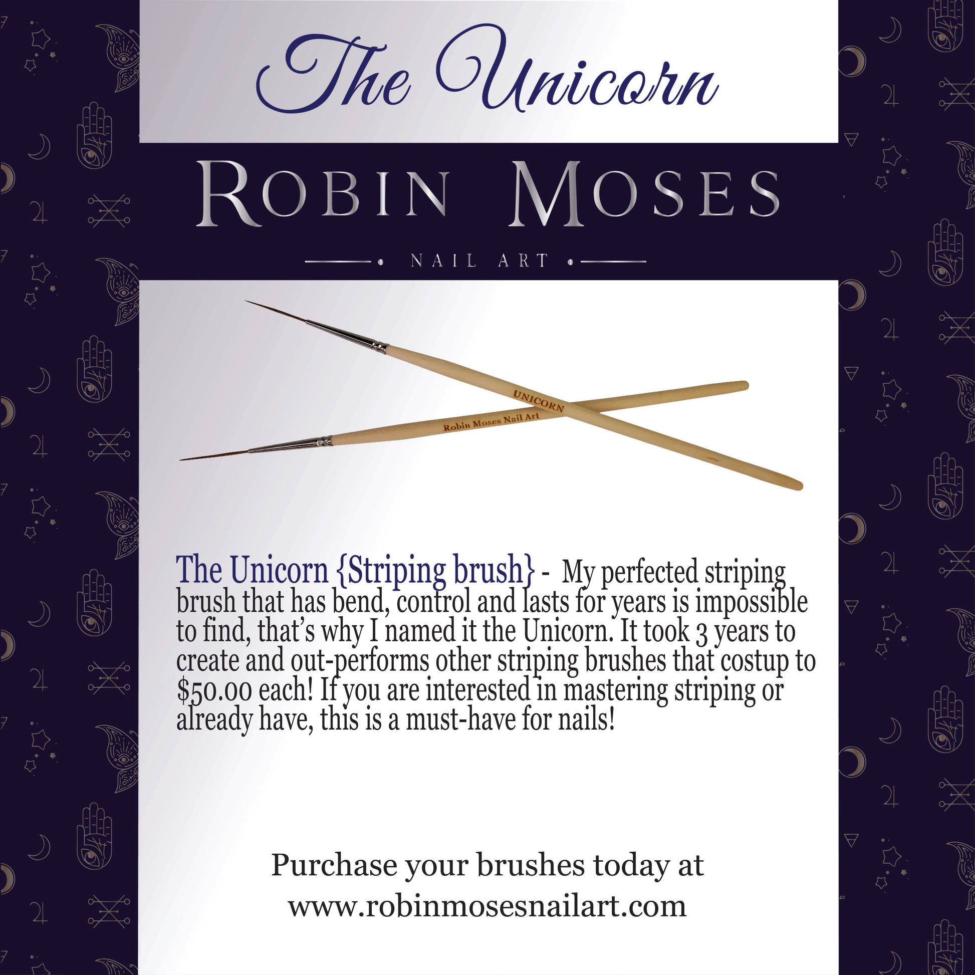 The Unicorn (Striping Brush) - Finding a striping brush that has bend, control and lasts years is impossible to find and so I named it the Unicorn. It took 3 years to create and out performs other striping brushes that cost up to 50.00 each. If you are interested in mastering stripes or already have, this brush is a must-have!